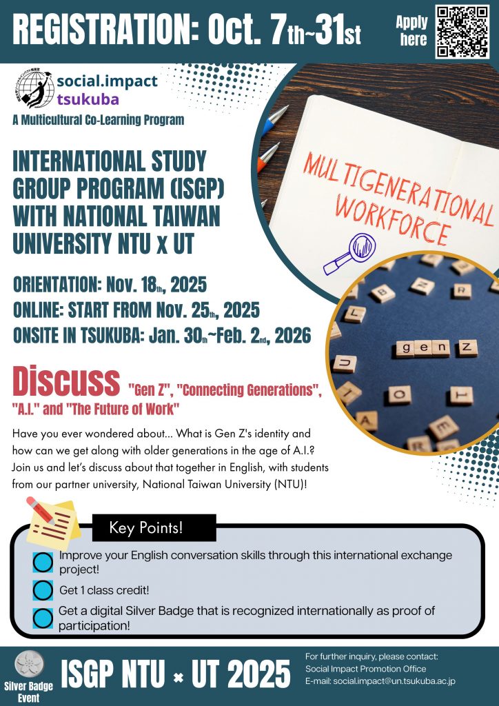 2025年度は「Z世代」「世代をつなぐ力」「AI」「未来の働き方」をテーマとして、NTUとUTの学生でつくった少人数グループで複数回オンラインディスカッションを行った後、NTUの学生が筑波大学を訪問して、対面で最終ディスカッション及び成果報告を実施します。