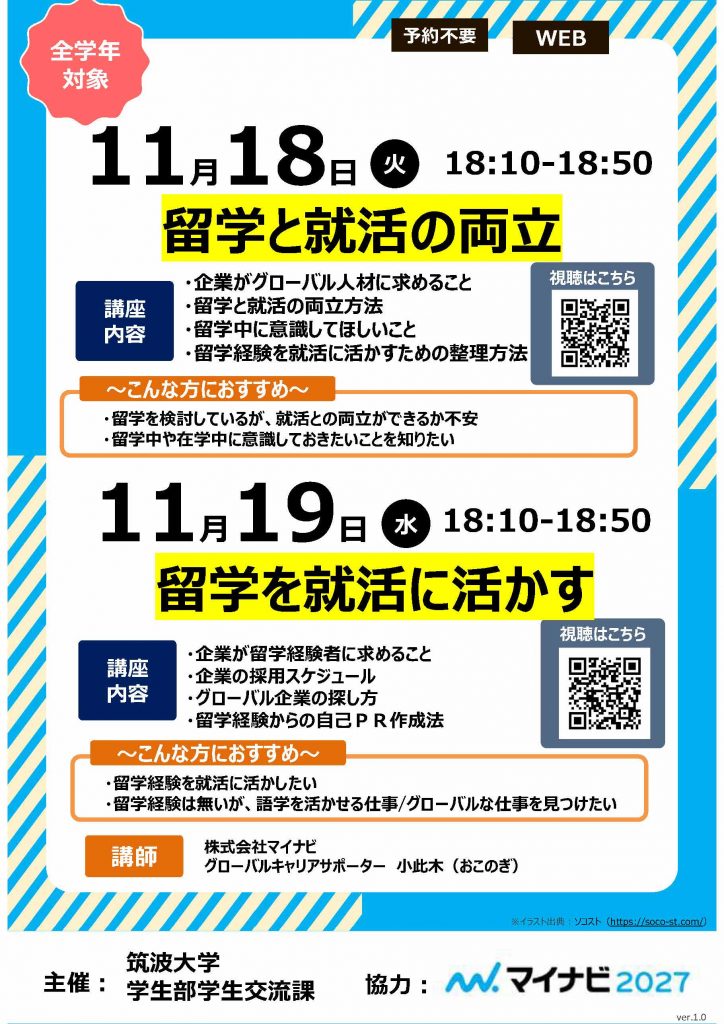 「留学に興味があるけど…」と思ったまま、なかなか前に進めないあなたの背中をそっと押すイベントです。留学に関する様々な説明会をギュギュっとまとめて開催します。一歩踏み出すヒントがきっと見つかります。ぜひお気軽にご参加ください!予約不要、筑波大生ならどなたでも参加OKです♪