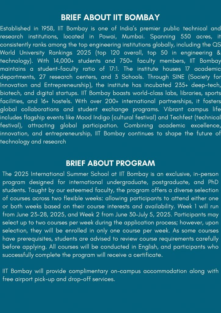 IIT Bobmbay has announced about 2025 International Summer School as below. Please apply through the forms if you are interested!