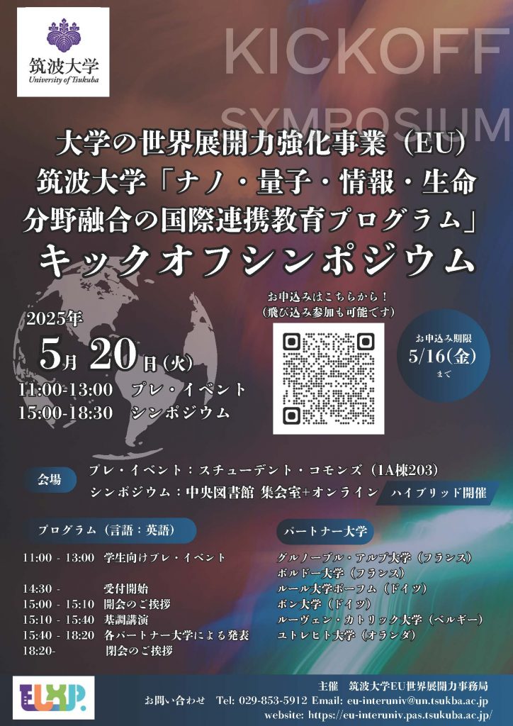 The University of Tsukuba’s Inter-University Exchange Project (EU) will host a kick-off symposium for the “International Cooperative Education Program with EU Universities for Interdisciplinary Fields of Nano-, Quantum-, Information-, and Bio- Technologies” on May 20th, 2025!