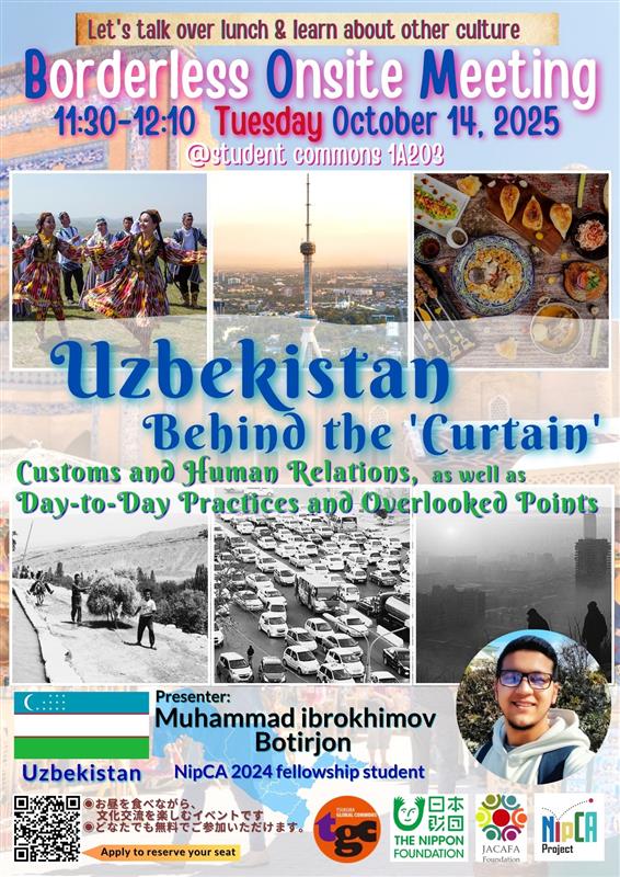 15回目となる今回は、NipCAフェロー2024のムハンマドイブロヒモフ・ボティルジョンさんが、母国ウズベキスタンの紹介をしてくれます。プレゼンテーションおよびチャット中の飲食、入退室は自由です。