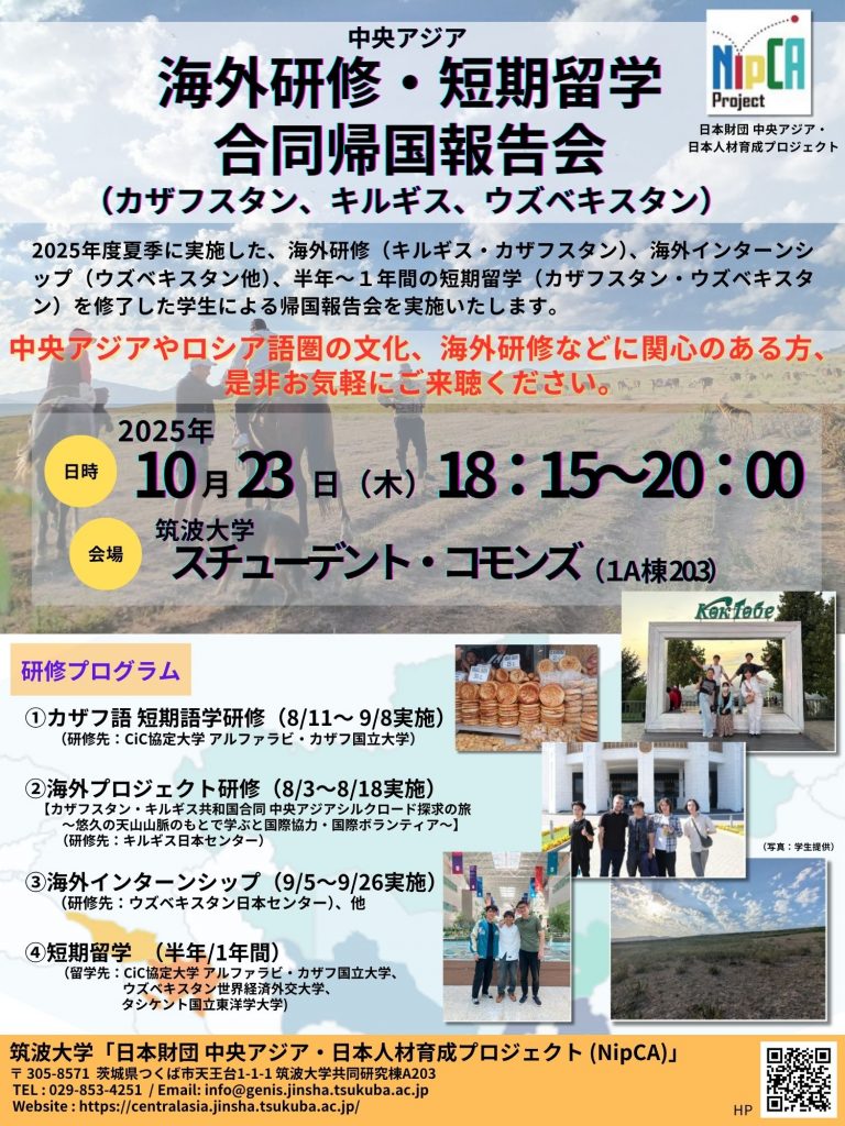 2025年度夏季に実施した、海外研修(キルギス・カザフスタン)、海外インターンシップ(ウズベキスタン他)、半年〜1年間の短期留学(カザフスタン・ウズベキスタン)を修了した学生による帰国報告会を実施いたします。