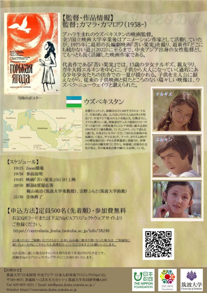 筑波大学NipCAプロジェクトでは、この度、中央アジア・コーカサス地域の文化とSDGsへの理解促進のため、オンラインによる第2回中央アジア・コーカサス映画上映会を開催することになりました。