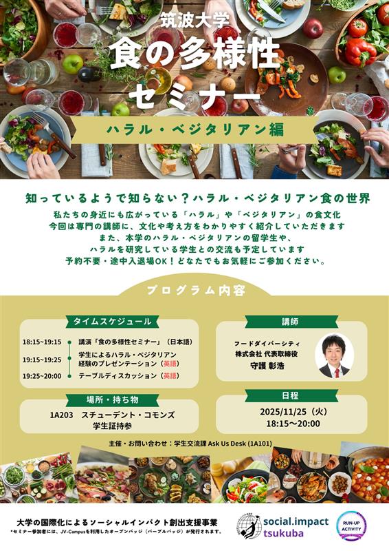 ベジタリアン、ヴィーガン、ハラル等、世界の多様な食文化に詳しいスペシャリストを招き、それらの食文化を正しく理解するための講演会を開催します。講演後はベジタリアンの学生やハラルを生活指標とするムスリムの学生から日本での食事にまつわる体験談などを聞きながら、学生同士の交流も予定しています。お互いの食文化について楽しく語り合いながら、理解を深めましょう! 事前申し込み不要・途中入退場OKですので気軽にご参加ください! ※講演会は英語字幕を表示します。