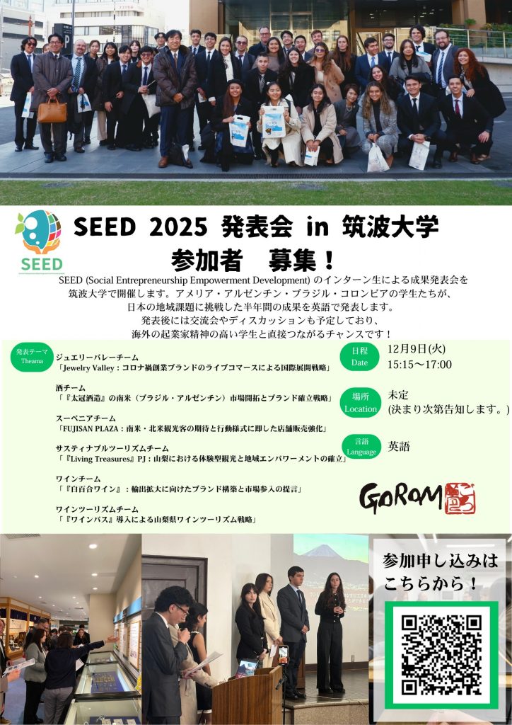 国際教育プログラム SEED (Social Entrepreneurship Empowerment Development) のインターン生による成果発表会を、筑波大学で開催します。2025年度のテーマは「日本・山梨県の地域文化と経済の活性化」。ラテンアメリカを中心とした学生たちが、日本の地域課題に挑戦した半年間の成果を英語で発表します。発表後には質疑応答や交流会も予定しており、海外の起業家精神の高い学生と直接つながるチャンスです!ぜひ気軽に参加してください。人数把握のため、下記フォームから事前登録をお願いします。