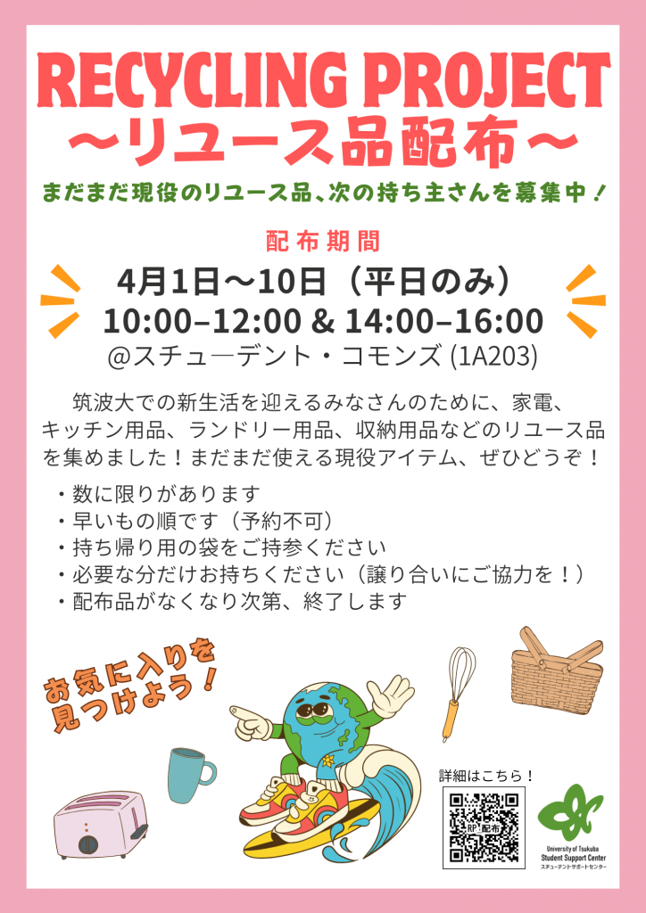 スチューデントサポートセンターでは、各学期の切り替わり時期に、まだ使用できるリユース品を回収し、筑波大学で新学期を迎える学生へ無料で譲渡するプロジェクト「Recycling Project」を実施しています。