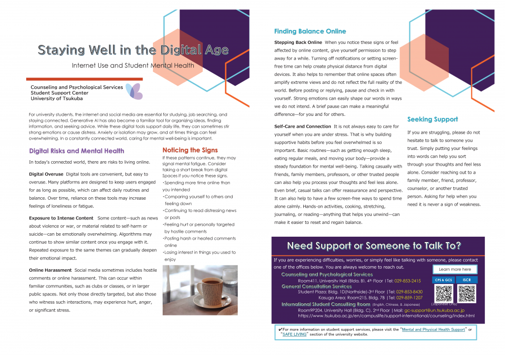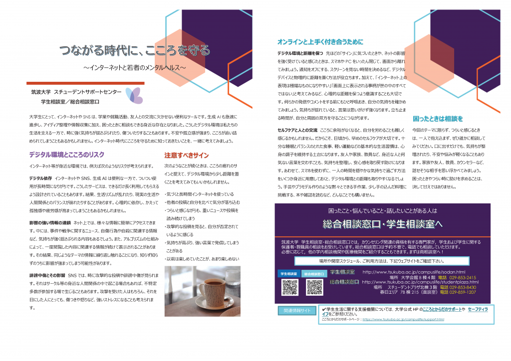 このたびスチューデントサポートセンター学生相談室では、学生向け心理教育用リーフレット「つながる時代に、こころを守る―インターネットと若者のメンタルヘルス―」を作成いたしました。本リーフレットは、インターネットやSNS、生成AIが身近な環境にある現在、学生の皆さんが自分のこころの状態に気づき、必要に応じてセルフケアや相談につながるための基本的なポイントをまとめたものです。