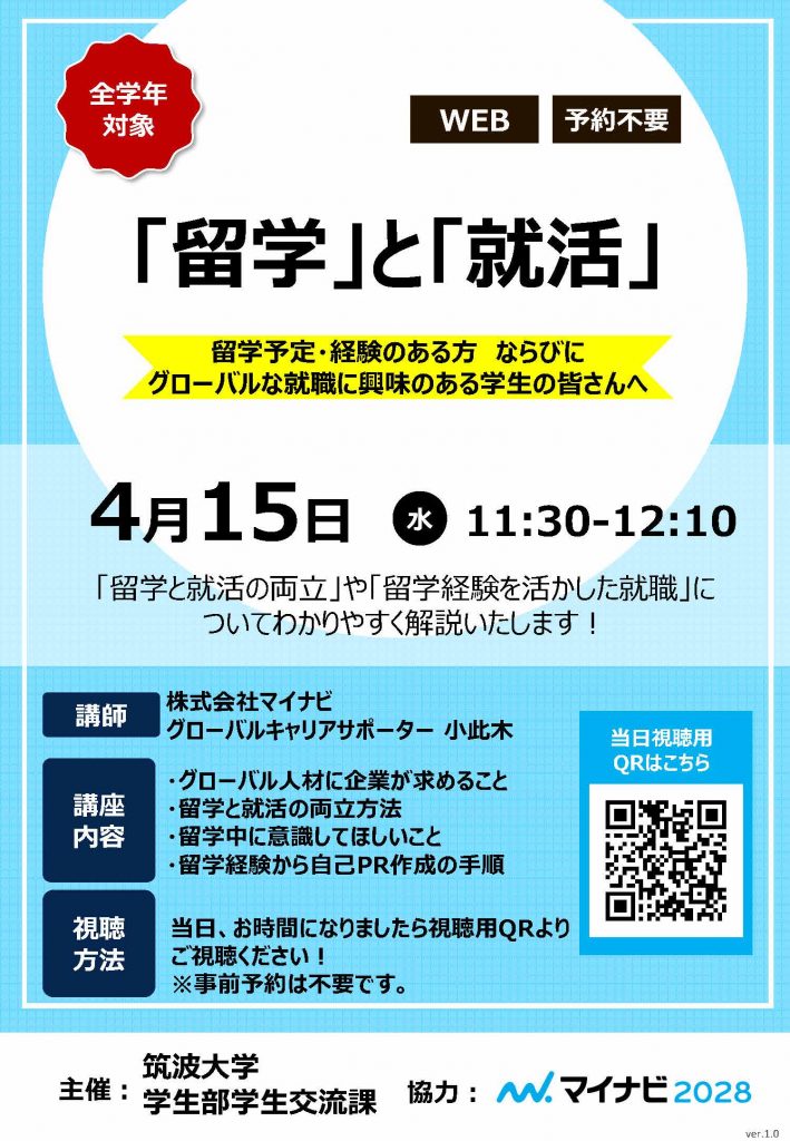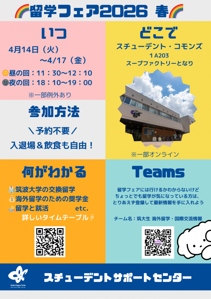 | 4/14(火) | 昼 | 交換留学の概要の説明会 | 学生交流課(国際事業) | 対面@スチューデント・コモンズ(1A203) |