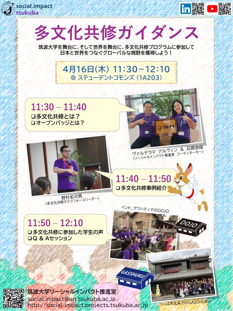 | 4/16(木) | 昼 | 多文化共修説明会 | 教育推進課(国際共修) | 対面@スチューデント・コモンズ(1A203) |