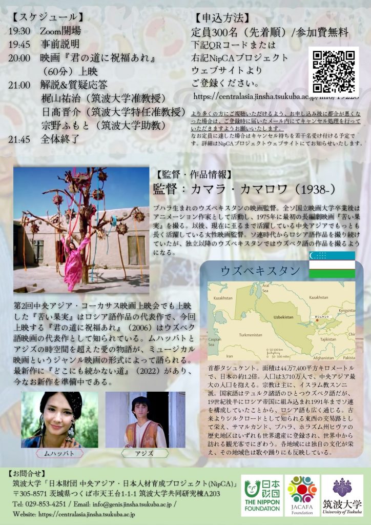 筑波大学NipCAプロジェクトでは、この度、中央アジア・コーカサス地域の文化とSDGsへの理解促進のため、オンラインによる第3回中央アジア・コーカサス映画上映会を開催することになりました。