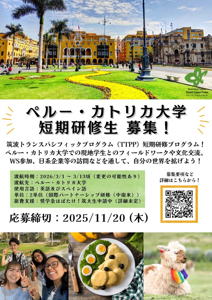 - \筑波トランスパシフィックプログラム(TTPP)2025年度ペルー・カトリカ大学短期研修生募集/筑波トランスパシフィックプログラム(TTPP)2025年度ペルー・カトリカ大学短期研修について、参加学生の募集を開始しました!応募締め切りは2025年11月20日(木)17:30です。興味のある学生は、下記リンク先の募集 …