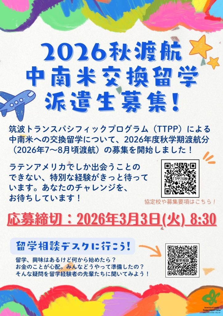 - 【募集】\中南米交換留学プログラム(筑波トランスパシフィックプログラム-TTPP)2026年度秋学期渡航分/中南米の協定校への交換留学プログラム(筑波トランスパシフィックプログラム-“TTPP”)について、2026年度秋学期渡航分(7~8月頃渡航)の募集を開始しました。応募締め切りは2026年3月3日(火)午前8:30です。興 …