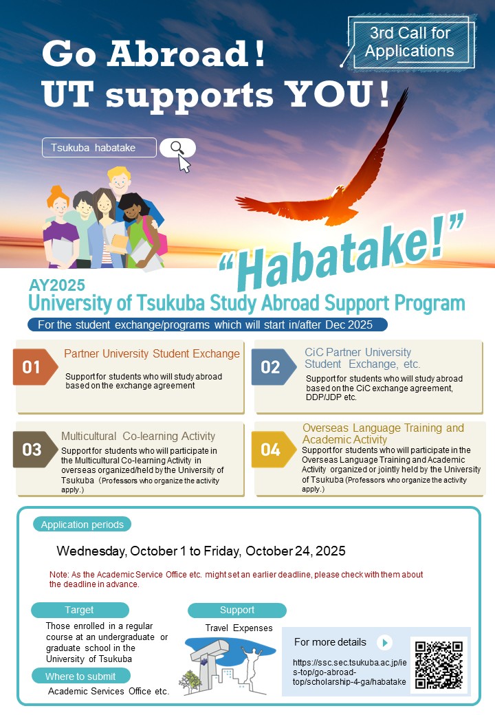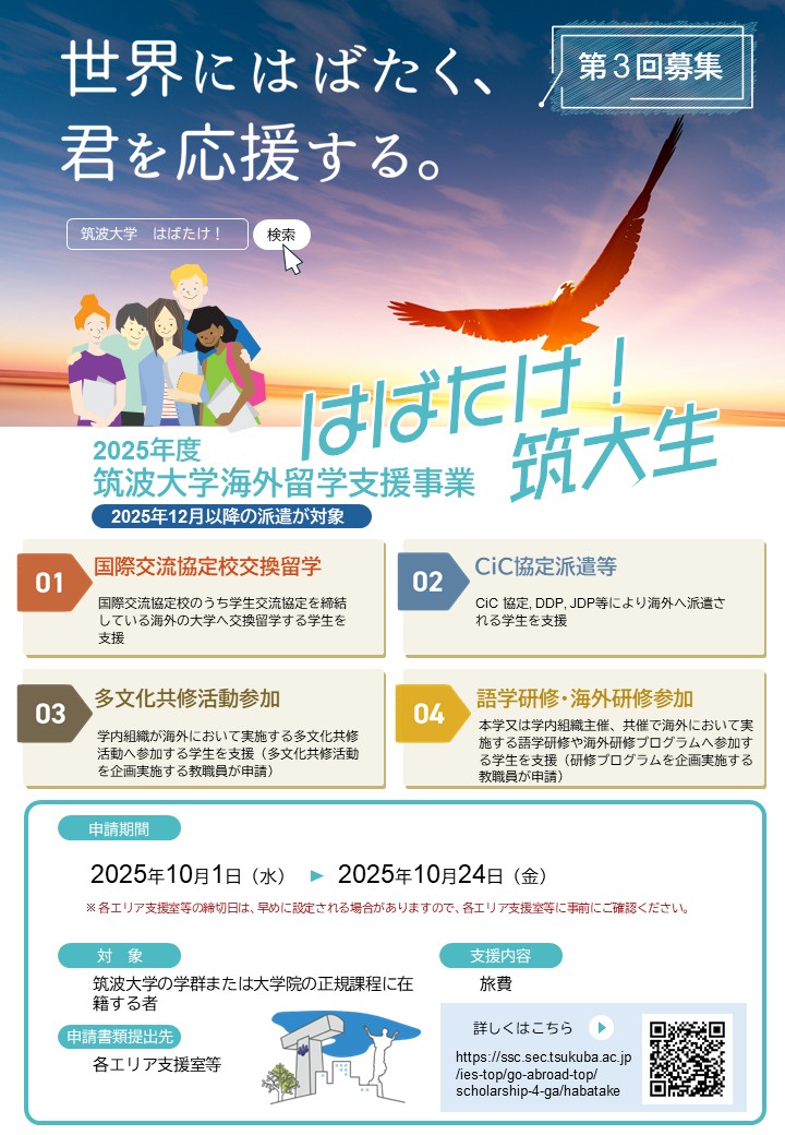2025年度海外留学支援事業(はばたけ!筑大生)の第3回募集を実施します。