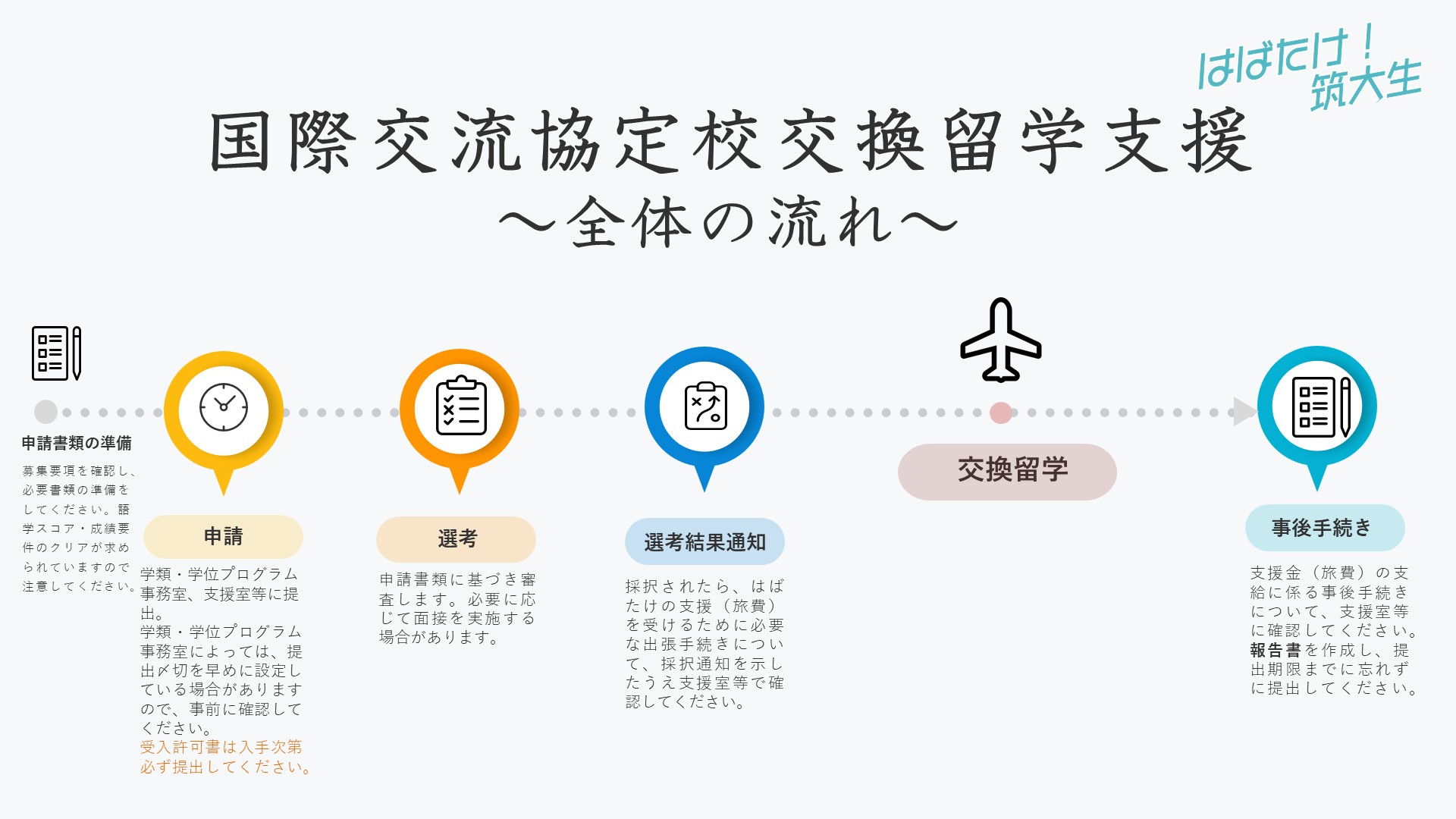 留学期間:2025年12月1日から2026年3月31日までに留学期間が開始し、かつ、1年以内の交換留学が対象です。また、留学先の大学等との間で締結された協定書に、年度を超えた期間の記載がある場合は、翌年度に跨った期間での申請を可とします。