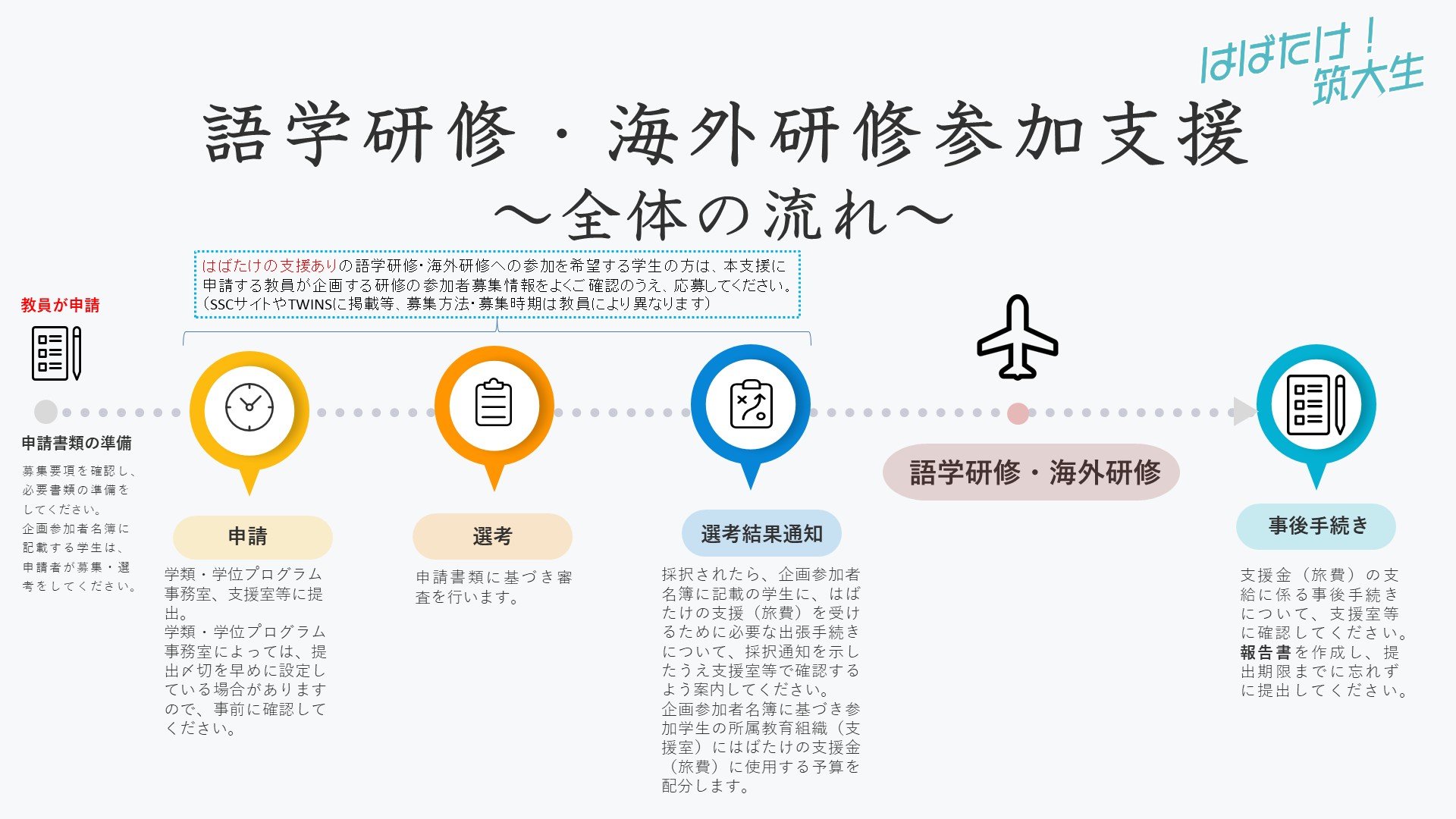A.本サイトの短期海外研修のページに掲載している実施予定一覧(PDF)(「支援金の種類」の欄に、はばたけの支援についての記載があるもの)やSSCサイト、TWINS掲示板のお知らせ等をご確認ください。